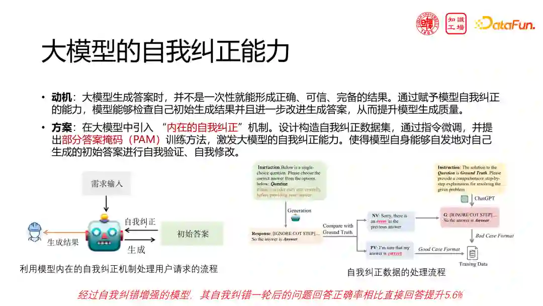 接下来的工作专注于提升大模型的自我纠正能力。对于复杂的专业问题,大模型不应仅提供一次性的答案,而应像专家一样进行思考和修正。因此,我们设计了一个大模型“内在的自我纠正”机制,设计构造自我纠正数据集,通过指令微调,并提出了部分答案掩码(PAM)训练方法,激发大模型在问答时进行自我迭代修正。具体来说,将数据中的问答对[Q/A]扩展为[Q/A1,A2,A3],并确保每次迭代中的答案[A2]优于[A1],[A3]优于[A2]。通过微调大模型,使其具备自我纠正的能力,即当给出初始答案[A]后,通过追问得到更完善的答案[A1、A2]。这种自我增强方法不仅提高了答案的正确率,而且将会应用于更大规模的模型训练中。