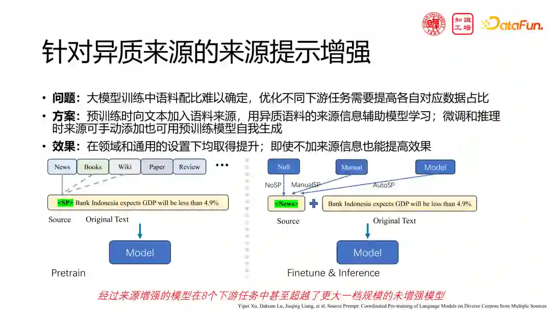 针对数据选择的问题,我们提出了一个创新的解决方案。在训练大模型时,无论是预训练还是微调,我们为语料添加了一个特殊的标记,以指示其来源,如“维基”、“新闻”、“小说”或特定网站(如“起点”)。这样,模型就能像人一样区分不同来源的数据,从而更加准确地评估其可靠性。实验证明,这种简单的“来源增强”方法在许多小任务中的表现,甚至超越了未增强的更大规模的模型。