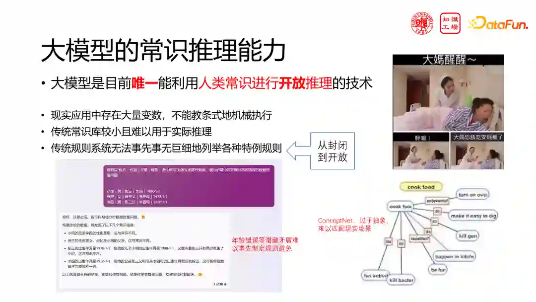 大模型是目前唯一能利用人类常识进行开放推理的技术。传统常识知识图谱在灵活应用常识于开放推理场景上受限,而大模型则能克服这一限制。