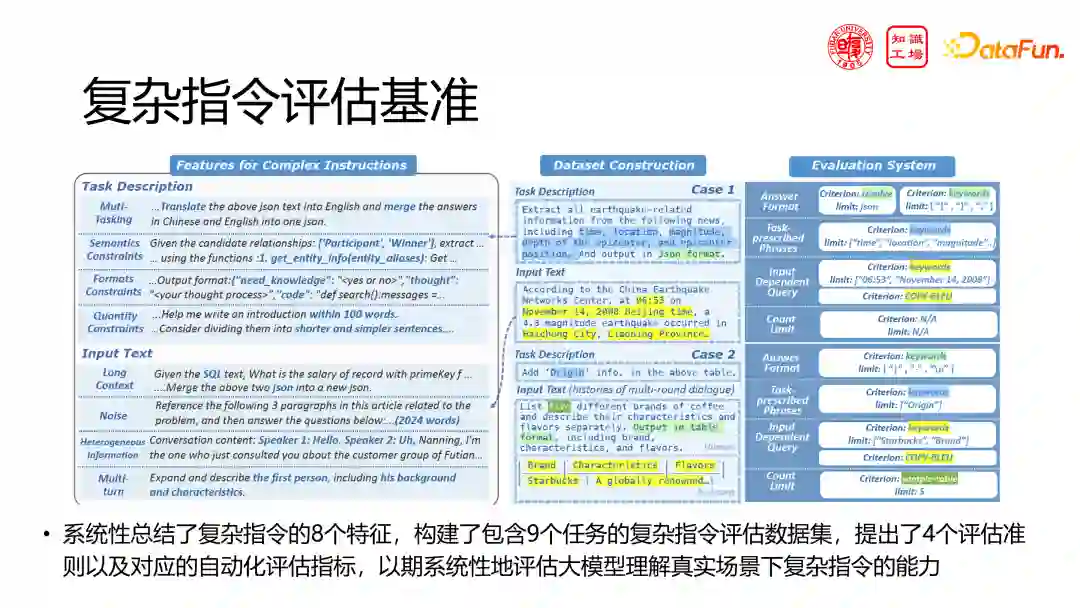 我们将复杂指令分为 8 个维度,通过自动化组合这些维度生成数据。在模型评估方面,我们更关注模型是否满足要求而非其智商或输出质量。由于是否符合要求可以通过程序自动判定,我们能够实现自动评估的效果。