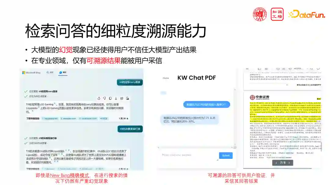 最后关于 RAG,聚焦于 AIGC 的可靠性问题。当前,即使大模型展现出高度智能,人们对其答案的准确性仍持怀疑态度,形成了所谓的“狼来了”现象。因此,在专业领域,我们强调只有可溯源的结果才能赢得用户的信任。RAG 系统要实现大模型在回答问题时能够引用原文,确保答案的可靠性和准确性。以 New Bing 的精确模式为例,即使搜索的网页内容正确,其答案仍可能出错。