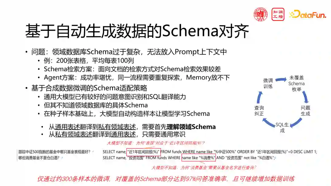 大模型在特定领域应用中并非能力不足,而是缺乏与领域的协同性。对于特殊需求,如 NL to SQL,需要通过微调使大模型适应特定任务。例如,在理解“基金表现最好”时,若未被告知其特定业务含义,大模型可能不准确。因此,需要在特定领域微调大模型。我们的做法是反向利用表格生成自然语言描述,再通过业务和产品经理的规则修正,最后训练模型以学习这些特定知识。除非面对极端复杂问题,否则大部分大模型的智能水平是足够的,关键在于任务协同和与现有流程的对齐。