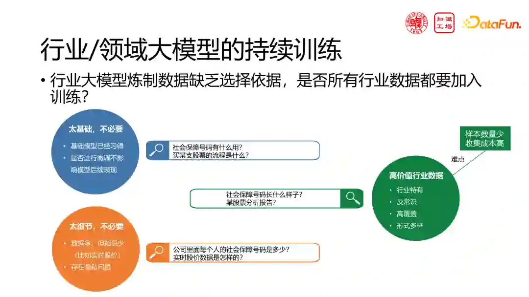 在领域大模型的训练中,数据的选择是一个关键问题。我们将数据分为三层:第一层是基础且不必要的数据,这些数据对于大模型来说已经足够了解,无需再重复训练;第二层是过于细节且不必要的数据,如实时股价等,这些数据对于人类专家来说也无需背诵,不适用于训练大模型;最重要的是中间层,即高价值行业数据,这些数据对于微调大模型至关重要。然而,这些行业数据数量稀少且收集成本高,导致精品语料占比小,而“垃圾”语料却占据大部分。尽管如此,两者都是不可或缺的。