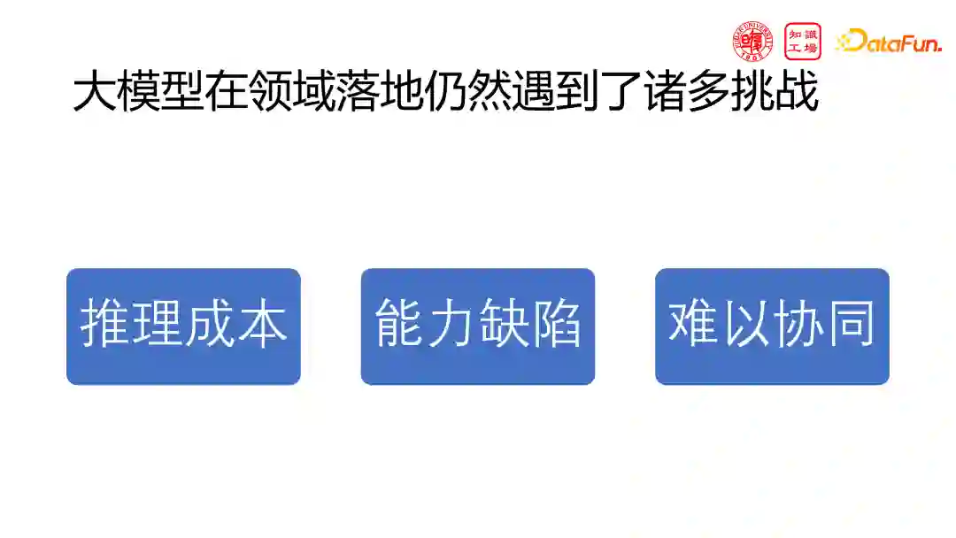 尽管大模型具有独特的甚至不可替代的优点,但我们也面临着大模型难以在领域落地的实际挑战。为什么这么强的大模型现在不能很好地被应用呢?我们也尚未看到大模型引领的工业革命的进行。这主要是由于推理成本、能力缺陷和难以协同三方面的挑战。
