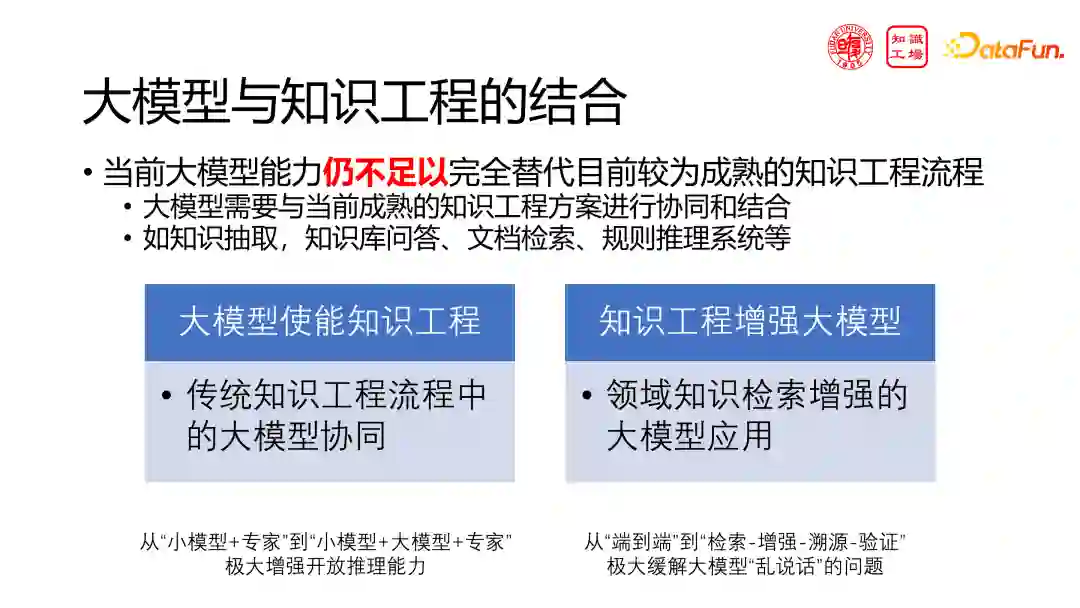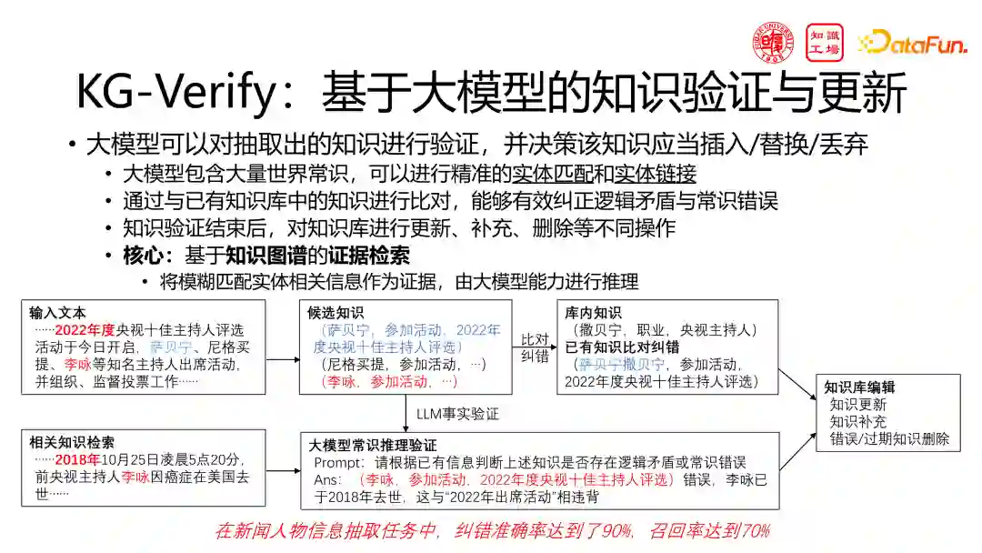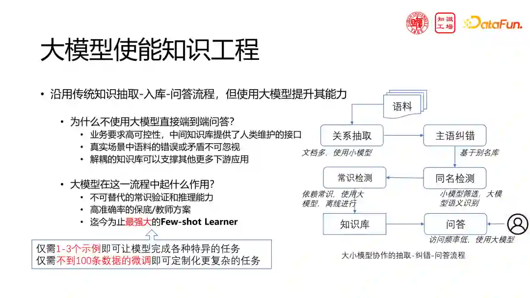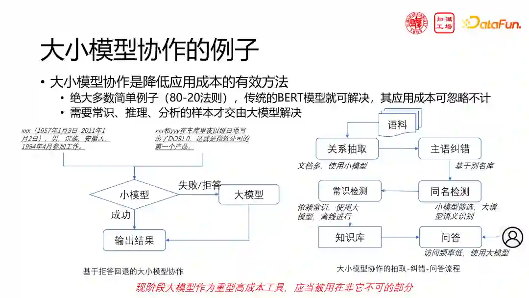 大模型虽功能强大但成本高昂,并非所有流程都需其参与。从数据层面和应用特点出发,可以将任务分类。对于大部分任务,传统BERT 模型即可实现 80% 至 90% 的准确率,仅在处理极端复杂句子时,大模型才是不可或缺的。对于大量语料的知识抽取和初步验证,传统模型因其高效和低成本而更为合适。然而,在知识库纠错和常识检测等需要开放性和高级理解的环节,大模型则成为了唯一选择。因此,大模型与小模型应协同工作,如上图中的两个典型例子,要根据任务需求去适配并执行一个流程。