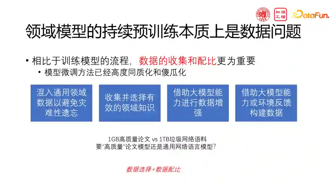 第二部分是关于大模型领域适配的研究。当前,领域大模型如医疗大模型、金融大模型等备受关注。持续预训练是构建这些模型的基本方法,虽然简单且开源,但数据问题至关重要。在选择训练数据时,面临两个主要挑战:一是数据质量,即什么样的数据是好的;二是数据配比,即如何平衡不同来源的数据。如维基百科与网络小说在数量和性质上存在显著差异,配比比例难以确定。过分依赖单一数据源可能导致模型出现偏差。如仅依赖维基百科可能导致模型缺乏娱乐性和现实感,而过多使用网络小说可能导致模型产生不符合实际情况的认知。