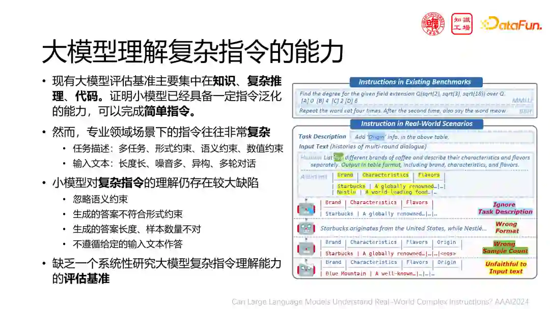 接下来探讨领域微调和能力提升。我们强调大模型协同能力的重要性,而不仅仅是模型在 MMLU 等考试题中的表现。首要工作是提升大模型理解复杂指令的能力。这与 GPT-4 Turbo 的发布会中提到的类似,即确保模型能准确输出可解析的 JSON 格式。我们发现,模型能否给出固定、可对接的表达至关重要。因此,我们需要评估并提升模型理解复杂指令的能力。这些指令可包括各种特定要求,如格式约束(如 JSON 输出)、内容约束(如简短或详细回答)等。通过将不同类别的特殊要求自由组合来测试模型是否能遵循这些复杂指令。这样,大模型不仅能作为聊天机器人,还能更准确地满足用户在创作文章或作为 Agent 的执行器时的各种需求。