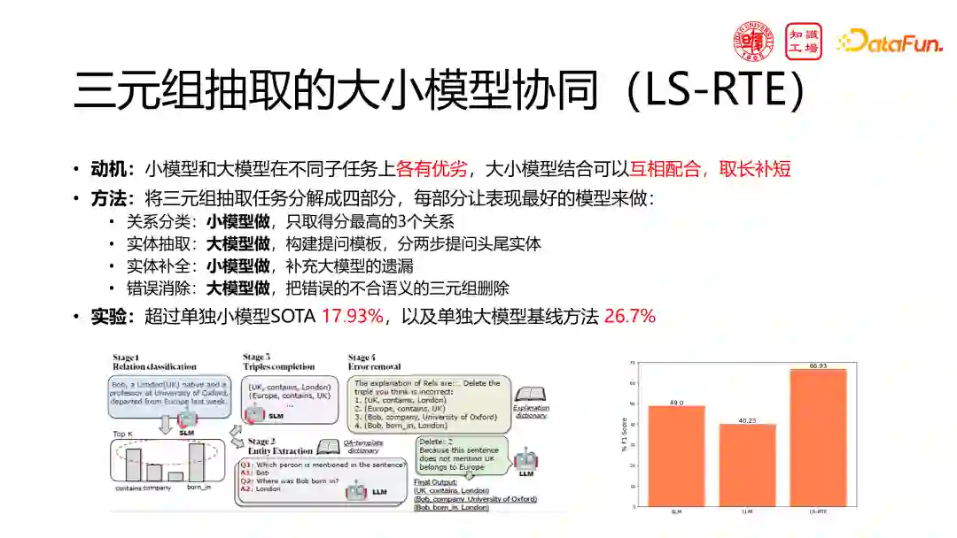 第二个工作是针对一个综合的知识抽取任务,融合了实体抽取、实体对齐和实体关系抽取等多个子任务。这些子任务在大小模型上的适应性各不相同。通过适当选择,部分使用大模型,部分使用小模型,能够实现既超越大模型又优于单独小模型 SOTA 的结果。