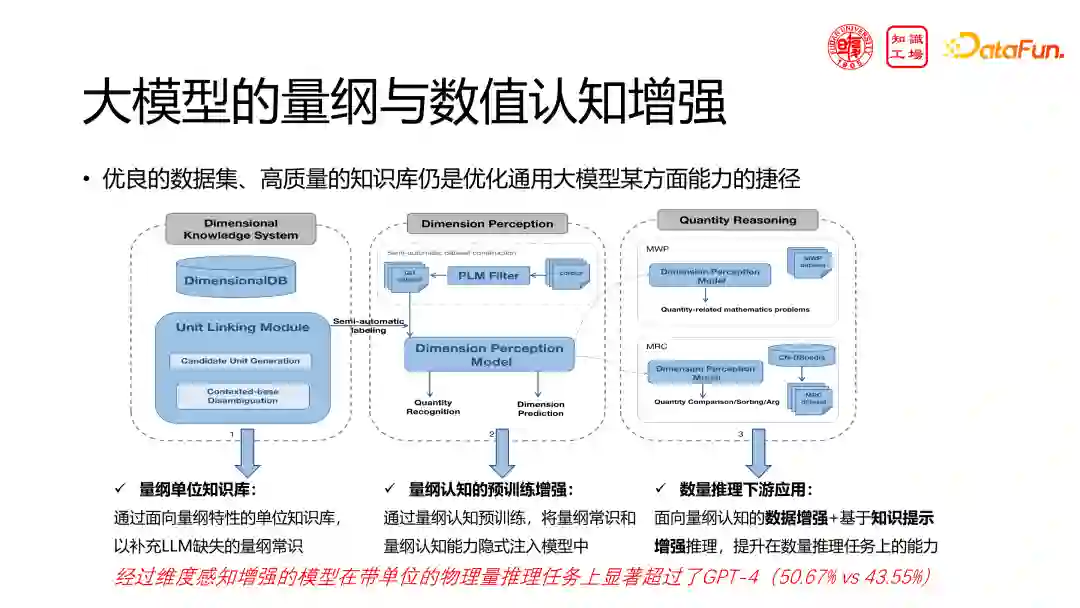 我们的工作基于物理学中的量纲定义,构建了包含量纲组合知识的语料库,并据此预训练模型。通过这种方法,预训练出的模型在带有单位量的推理任务中表现出色,甚至超越了当时 GPT4 的性能。