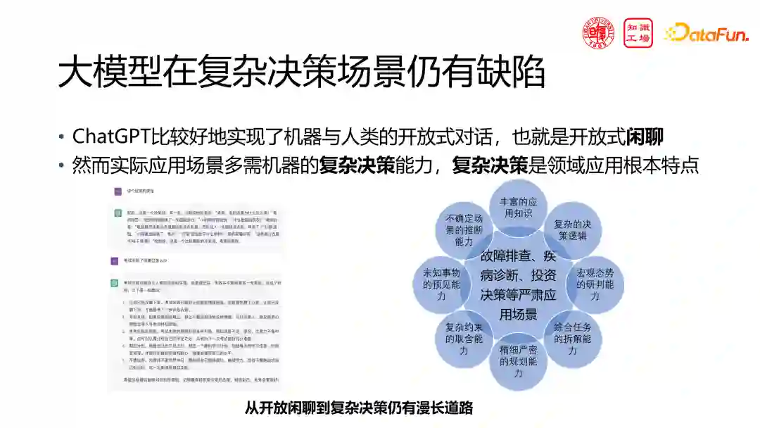 挑战二:大模型在复杂决策场景仍有缺陷。尽管大模型在聊天机器人等开放式闲聊场景中表现出色,但在工业、商业等严肃场景中,如替代程序员编写代码,大模型目前仍显不足。从开放式闲聊到复杂决策,大模型还有很长的路要走。目前的大模型,如 GPT-3 或 GPT-4,无法直接应用于特定场景,仍需要用户通过多次交互和提供 prompt 来引导。尽管许多工作正致力于提升大模型的能力,有可能发布的 GPT-4.5 或 GPT-5 等新一代模型能进一步提升性能,但即便如此,是否足够满足实际应用需求仍存有疑问。