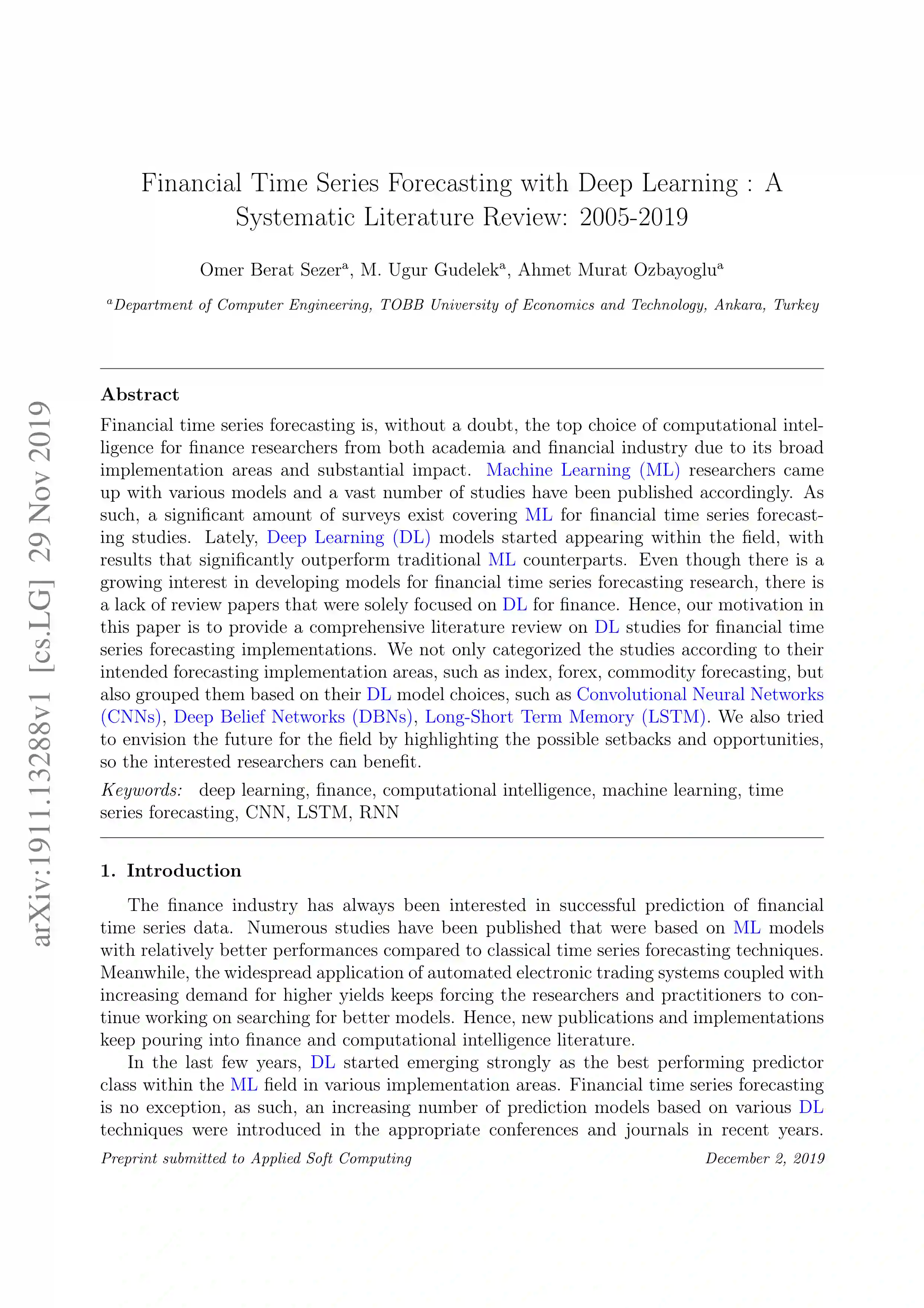 毋庸置疑,金融时间序列预测由于拥有广泛的应用领域和巨大的影响力,其正成为成为学术界和金融业研究人员研究计算智能的首选。机器学习(ML)研究者提出的各种各样的模型和所做的大量研究都已经被公开。比如:目前有大量关于将机器学习用于金融时间序列预测研究的调查。最近,深度学习(DL)模型也开始被运用到这个领域,且DL方法显著优于传统的ML方法。尽管人们对开发金融时间序列预测的模型越来越感兴趣,但是目前缺乏专门针对DL的金融文献综述。因此,这篇论文是想提供一个关于DL方法在金融时间序列预测研究方面如何实现的文献综述。我们不仅根据预测已经实施的领域(如指数、外汇、商品预测)对研究进行了分类,而且根据DL模型的选择对研究进行了分组(如CNNs,DBNs,LSTM)。我们还试图通过强调可能出现的挫折和机遇来展望该领域的未来,使得对该领域感兴趣的研究人员能够从中受益。