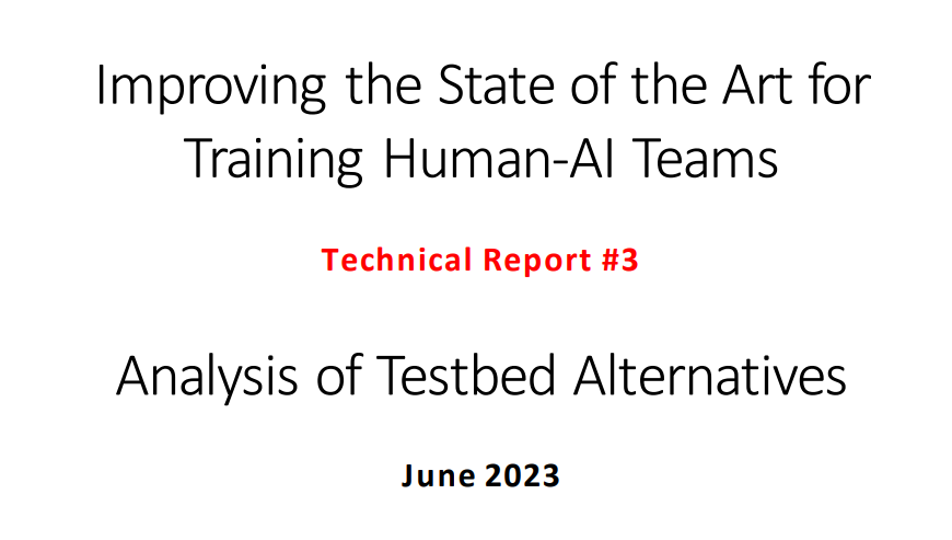 Sonalysts 正在开展一项计划,通过开发该领域的原创性研究,将我们目前在团队合作方面的专业知识扩展到人类-人工智能(AI)团队。为了给这项研究奠定基础,Sonalysts 正在调查合成任务环境 (STE) 的开发情况。在上一份报告中,我们记录了最近一次外联工作的结果,在这次外联工作中,我们请军方主题专家(SME)和人类-人工智能团队领域的其他研究人员确定他们最看重的测试平台的品质。这次外联活动的一个惊人发现是,一些受访者建议我们的团队研究现有的人类-人工智能协同测试平台,而不是创建新的测试平台。根据这一建议,我们对相关情况进行了系统调查。在本报告中,我们将介绍调查的结果。在调查结果的基础上,我们制定了测试平台评估标准,确定了潜在的测试平台,并对候选测试平台进行了定性和定量评估。在评估过程中,我们提出了五个候选测试平台供研究团队考虑。在接下来的几个月中,我们将评估各种备选方案的可行性,并开始执行我们的研究计划。