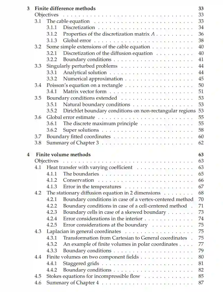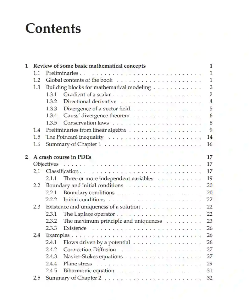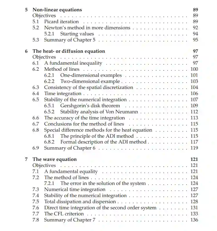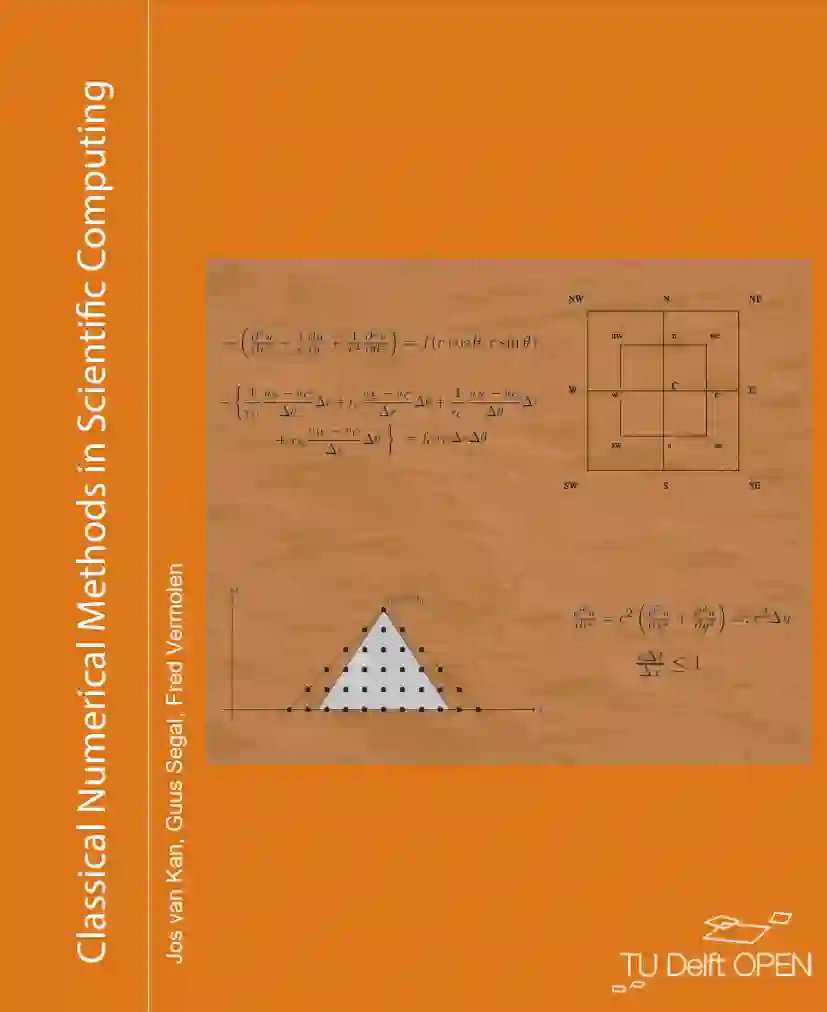 偏微分方程在数学建模中占据重要地位,其在工程和科学中有广泛应用。本书首先提供了偏微分方程的速成课程,以帮助读者熟悉其基本性质,如解的存在性、唯一性和可能存在的最大原则。本书的主题是描述用于近似偏微分方程解的经典数值方法。重点是离散化方法,如有限差分法、有限体积法和有限元方法。手稿还简要探讨了离散化方法应用于偏微分方程后产生的大型(非)线性代数方程组的解。本书讨论了这些离散化方法的构建以及一些误差分析,其中指出,对于有限元方法的误差分析仅为描述性的,而不是从数学角度上严格的。最后几章专注于经典时变偏微分方程的时间积分问题。读完本书后,读者应能够推导有限元方法,实施这些方法,并判断所得的近似值是否与偏微分方程的解一致。读者还将为其他经典离散化方法获得这些技能。掌握这些基本知识将使读者能够继续研究更高级的方法,如无网格方法、不连续的Galerkin方法和用于近似偏微分方程解的谱方法。