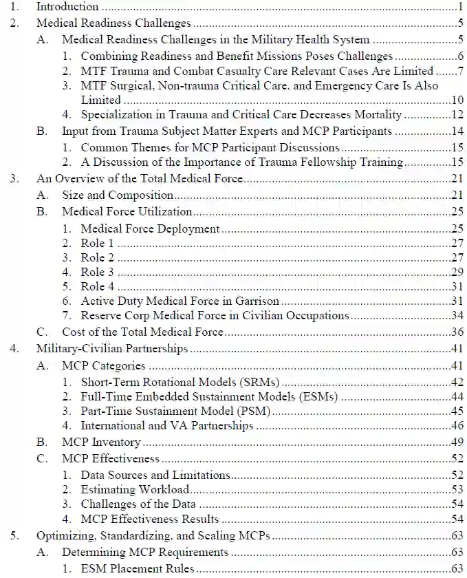 伊拉克战争和阿富汗战争揭示了当前医疗部队和基于 MTF 的培训模式所面临的重大战备挑战。具体来说,MTF 的病例组合和数量无法满足现役战斗伤员救护队(CCCT)主要人员的技能维持需求(或 "医疗准备"),这些人员需要在几乎没有后备力量的艰苦环境中部署和开展救生和救肢创伤救护工作。为应对这些挑战,《2017 财年国防授权法案》(NDAA)指示对军队医疗系统(MHS)进行全面改革。其中第 708 条指示与大型民用创伤中心建立军事民用合作伙伴关系 (MCP),为军事医疗服务提供者提供更多接触大量危重伤员的机会。