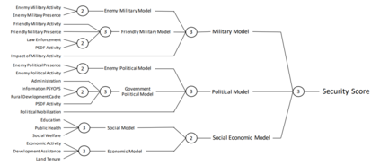 特别是,最初的 HES 是由各种 "子模型分数 "组成的,这些分数根据调查反馈来衡量每个地区的不同方面(如经济变量、地方行政管理、敌方军事存在)。然后,该系统通过使用预定义决策表确定如何合并不同分数的三级分层汇总方法,将这些分数合并为一个单一的安全分数。然后将安全分数提交给空军指挥官,由他们做出目标选择决策。因此,我们的目标是通过改变基本决策表来修改 HES,找到能优化各种发展目标的决策表,同时限制个别地区这些目标恶化的风险。