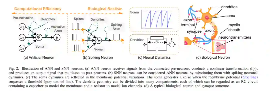 人工智能(AI),特别是机器学习(Machine Learning, ML)的迅猛发展,催生了日益复杂的模型,这些模型在自然语言处理(NLP)[1]、计算机视觉(CV)[2]、个性化推荐系统[3]以及时间序列预测[4]等多个领域取得了最新的先进性能(SOTA)。这些 AI 驱动的应用正在深刻改变人类的日常生活。 传统的 AI 应用高度依赖云端所提供的大量计算与存储资源。由物联网(IoT)设备及其他边缘源生成的海量数据通常被传输至集中式服务器进行处理和管理,用户再通过云端访问数据以获取所需结果 [5]。然而,这种以云为中心的架构面临多项关键挑战,包括吞吐量低、延迟高、带宽瓶颈 [6] 以及日益突出的数据隐私问题 [7]。为缓解这些问题,边缘计算被提出作为一种前景广阔的计算范式,通过将 AI 服务迁移至接近数据源的位置(如 IoT 设备和终端用户)执行,从而降低延迟、减轻带宽压力、并提升系统可靠性与用户体验。 尽管边缘智能具备诸多优势,传统方法依然高度依赖计算资源,对 CPU、GPU、内存及网络带宽提出了严格要求 [8]。这种资源依赖性极大限制了复杂 AI 模型在普遍边缘设备上的部署。尽管智能手机等设备的硬件性能不断增强,但仍难以支撑许多深度学习模型。例如,当前多数语音助手(如 Apple Siri 和 Microsoft Cortana)仍需依赖云端运行,一旦失去网络连接便无法工作 [9]。同时,AI 模型日益增长的计算需求已超过摩尔定律所预测的硬件性能提升速度 [10],预示着传统计算架构将遭遇性能瓶颈。因此,亟需开发新型的、资源高效且具可扩展性的解决方案,以支撑未来的边缘智能发展。 脑启发计算(Brain-Inspired Computing, BIC)[11] 正在成为一种前景广阔的计算新范式,其核心思想是将神经机制与类脑计算策略引入算法与系统设计之中 [12]。其中,脉冲神经网络(Spiking Neural Networks, SNNs)[13] 及其源自神经科学的机制被广泛应用于提升模型的学习能力与能效。当前的算法研究主要通过在常规硬件平台(如 CPU 和 GPU)上的模拟执行来开展,旨在指导下一代类脑硬件的设计与优化 [14]。 类脑系统 [10] 在推动新型计算架构的发展中发挥着关键作用,其通过仿生设计实现了可扩展、高能效与实时性强的计算能力。将 SNN 算法与专用类脑硬件集成后,系统可在边缘实现高能效、低功耗、强鲁棒性的智能应用 [15]。 为推动这一融合边缘计算与脑启发计算的新兴范式的发展,即基于脉冲神经网络的边缘智能(EdgeSNNs),必须首先明确当前 SNN 技术的研究进展,并评估其在边缘场景中的可部署性。现有研究涵盖了从单神经元机制到网络级 SNN 架构及其学习范式的多个层次。与人工神经网络(ANNs)不同,SNN 保持静态网络结构,同时引入神经动态过程,其脉冲生成受生物物理机制调控。为应对动态复杂性带来的计算负担,泄漏积分-发放(Leaky Integrate-and-Fire, LIF)模型[16] 及其变种被广泛采用作为基础神经元模型,以提升计算效率。 当前的 SNN 学习算法可大致分为无监督学习与有监督学习[17]–[19]。后者又进一步细分为ANN 到 SNN 转换(ANN2SNN)方法与直接训练方法。在资源受限的边缘环境下,开发具有生物可解释性的高效学习算法成为关键挑战。我们认为,采用更贴近生物机制的神经元模型具有显著潜力,有望提升类脑计算系统的适应性与能效。然而,要在实际应用中部署 EdgeSNN,还需从多个关键维度进行系统评估,包括任务表现、计算效率与模型可训练性。 基于现有文献,我们将 EdgeSNN 应用中的三类现实需求归纳如下: 1. 边缘设备部署与推理:该方向关注将轻量化的 SNN 模型部署至资源受限的边缘设备,实现低延迟、低功耗的本地推理,并减少对云端资源的依赖。该范式主要解决实时应用中延迟与通信开销问题。核心技术挑战在于,在确保模型准确率的同时,显著降低计算与内存开销。现有方法大致分为:轻量模型设计[20][21] 与后处理模型简化[22]–[24],二者均致力于在性能几乎无损的前提下降低 SNN 的复杂度。 1. EdgeSNN 的训练与更新:该方向强调在设备本地进行学习,利用本地数据训练模型,从而降低将数据上传云端所带来的隐私与安全风险。然而,边缘设备资源受限,加之数据分布的动态变化 [25],使得本地训练面临诸多挑战。为此,提出了两类互补策略:(1)通过优化内存与计算消耗,实现高效的单设备本地训练[26];(2)实现多设备协同学习 [27],或与中心云端协同训练 [28]。在协同学习场景中,通信效率至关重要,更新频率与传输成本显著影响模型性能。 1. EdgeSNN 的安全与隐私保护:该方向旨在防御潜在攻击与隐私泄露。在协同训练中,即使未直接共享原始数据,模型更新中也可能泄露隐私,特别是当更新中包含能反映特定设备或环境的数据模式时 [29]–[31]。此外,由于训练高度依赖本地数据,系统容易遭受对抗样本注入或数据投毒攻击[32],攻击者可通过恶意输入破坏模型训练,造成性能下降或行为偏差 [33]–[35]。