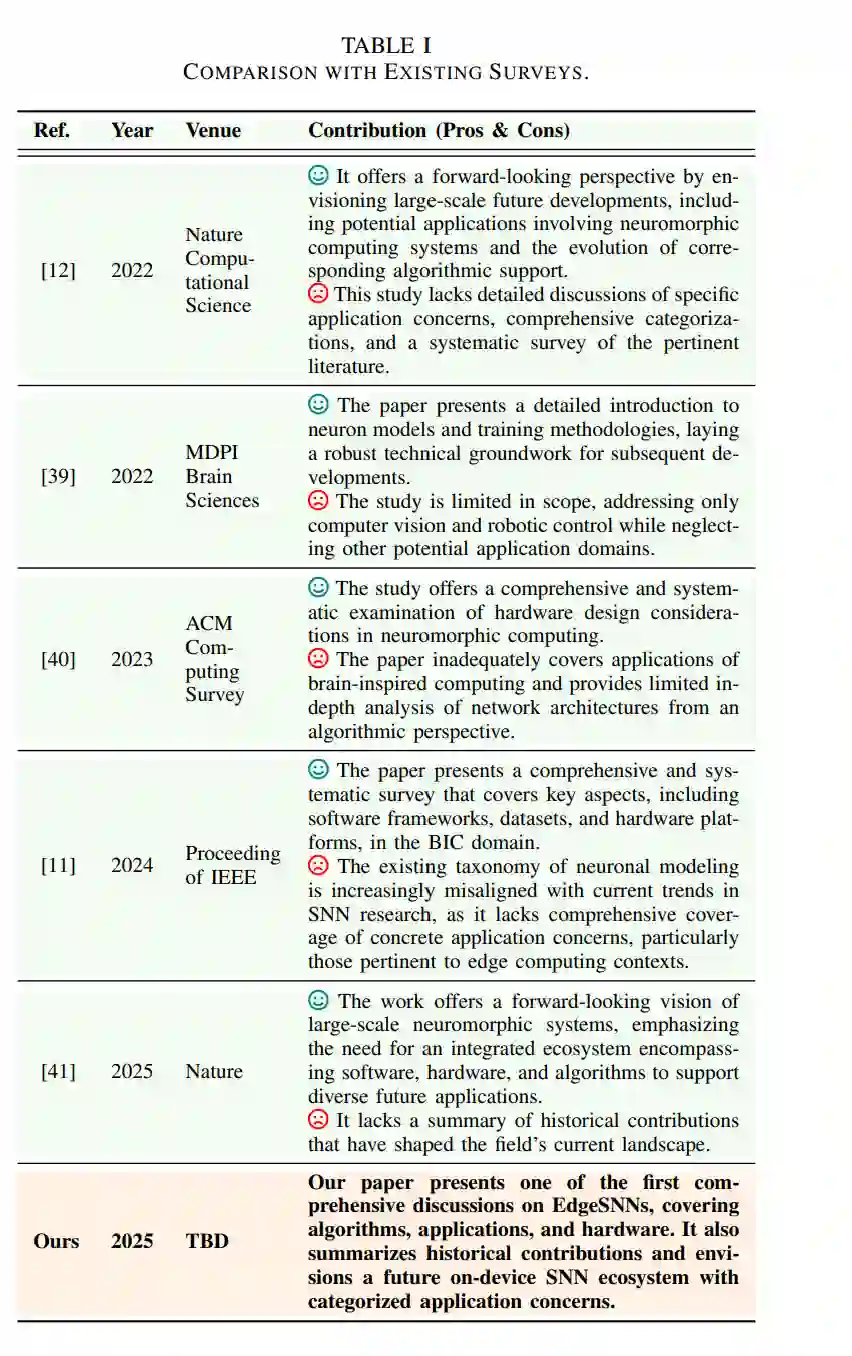 尽管上述实际考量构成了 EdgeSNN 的应用基础,一个根本性问题仍未解决:如何构建全面的评估机制,确保这些模型能满足现实边缘应用中的多样化与严格需求。 目前类脑硬件仍处于初期发展阶段,尚未形成主流商用平台。因此,现有对 EdgeSNN 的评估主要基于 Raspberry Pi 与 NVIDIA Jetson 等常规边缘设备 [15][36][37]。虽然这些平台能有效反映边缘资源限制,但它们并未专为类脑计算设计,因此在性能上仍存在局限与偏差。为此,本文提出了一种双轨评估框架[38],旨在实现对 EdgeSNN 性能的公平评估,支持不同模型在异构设备上的客观比较,指导面向硬件优化的研究,并通过量化准确率与资源消耗之间的权衡,为商业化落地提供决策依据。 尽管取得了一定进展,EdgeSNN 的现实应用仍面临来自硬件、软件与算法多个层面的开放挑战,包括:硬件异构性、软件生态尚不成熟、边缘数据有限且分布动态变化,以及缺乏标准化评测体系等。这些问题阻碍了高效、可适应、可扩展的 EdgeSNN 解决方案的形成。要有效应对上述挑战,需要在软硬件协同设计、抽象接口构建、受限资源下的自适应学习以及标准评测机制等方面取得协同突破。 总之,本文系统回顾了用于或可适用于 EdgeSNN 的技术方法,并提供了与现有相关综述的对比,如表 I 所示。此外,本文还提供了一个配套 GitHub 仓库2,整理了所涉及文献与资料。本文的主要贡献包括: * 全面综述:据我们所知,这是首篇专注于 EdgeSNN 系统部署的综述论文,涵盖其核心方法、典型 AI 任务中的应用场景,以及在多种边缘环境下的部署策略。 * 系统分类框架:提出一个系统化的技术分类框架,对 EdgeSNN 的关键构成模块及其应用问题进行整理,为解读当前 SOTA 方法及其运行机制提供理论支撑。 * 挑战与未来方向:在现有分类体系与实际应用基础上,系统归纳当前研究面临的挑战,并提出未来可能的发展路径,旨在提高研究的系统性与严谨性,并回应不断演化的技术趋势。