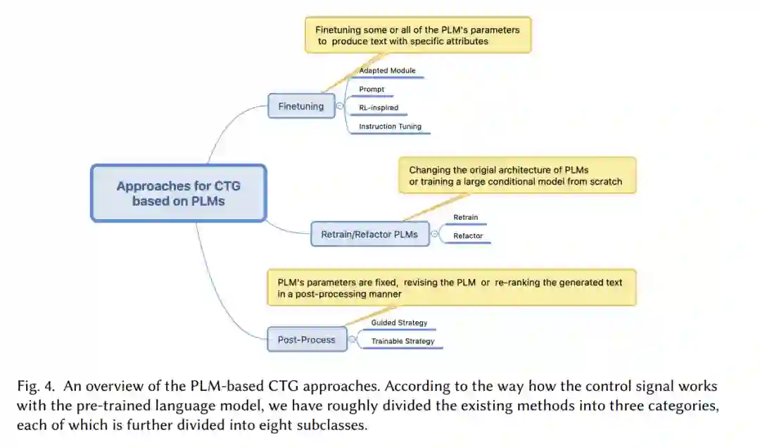 基于PLM的CTG的核心思想是以显式或隐式的方式给模型一个控制信号,来驱动满足控制条件的文本生成。根据控制信号的作用方式,我们大致将现有的方法分为三个类别,每个类别进一步分为几个子类。在图4中给出了一个概述。最直接的方法是微调PLM,这可以以较低的成本执行CTG任务。第二种方法是为CTG重新训练或重构PLM。原则上,这种方法可能产生更好的结果,但可能消耗更多的计算资源,也面临着缺乏标记数据的问题。随着PLM的参数大小迅速增加,即使是微调也变得资源密集。为了解决这些问题,第三类文本生成方法,即在解码时间工作的后处理方法,已经出现。在后处理方法中,PLM始终是固定的,控制信号在解码阶段工作。这样的方法不仅需要较少的计算资源进行训练,而且在一定程度上也能保证生成文本的更好质量。因此,近年来学术界对这个方向的关注正在增加。在以下几节中,我们将更详细地回顾与这三种类型的方法相关的最近文献。评价方法自然语言生成(NLG)模型的性能由适当的评估指标来反映。由于需要满足控制元素,可控文本生成(CTG)与一般的NLG任务略有不同。因此,CTG不仅关注生成文本的质量,还关注生成文本是否满足控制元素。因此,我们通常使用一般和CTG特定的指标来评估CTG模型。对于任何CTG模型,评估生成文本的一般质量是至关重要的,例如:1)流利度:输出文本中的语言有多流利[12, 31],2)事实性:生成的文本在多大程度上反映了上下文中描述的事实[46, 146],3)语法:生成的文本在语法上是否正确,4)多样性:生成的文本是否具有多种类型或风格的范围。这些一般评价方面的测量方法可以基于执行评估的对象(如图7所示)分为三类:人类或机器。