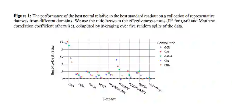 在许多涉及图神经网络的学习任务中,通过读出函数将节点特征有效地聚合为图级表示是必不可少的一步。通常,读出是简单且非自适应的函数,其设计使得得到的假设空间是排列不变的。先前对深度集的研究表明,这样的读出可能需要复杂的节点嵌入,通过标准的邻域聚合方案很难学习。基于此,我们研究了神经网络给出的自适应读出的潜力,这些神经网络不一定会产生排列不变的假设空间。我们认为,在一些问题中,如分子通常以规范形式呈现的结合亲和性预测,可能会放松对假设空间排列不变性的约束,并通过使用自适应读取函数学习更有效的亲和性模型。我们的经验结果证明了神经读出在跨越不同领域和图特征的40多个数据集上的有效性。此外,我们观察到相对于邻域聚合迭代次数和不同的卷积运算符,相对于标准读数(即和、最大值和平均值)有一致的改进。