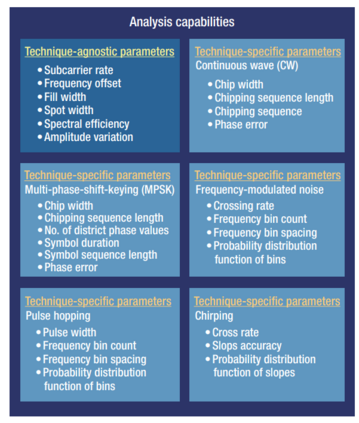 分析过程可以分成两个步骤: (1)分析与技术类型无关的参数,和(2)分析技术特定的参数。第一类包括诸如副载波率、中心频率偏移、填充宽度、斑点宽度(覆盖率)、光谱效率和光谱振幅变化等参数,它们适用于我们团队可能分析的任何波形。第二类包含一个更广泛的参数列表,根据波形技术的不同,可以分为五个子类别。目前在每个子类别中可以分析的参数的完整列表见图3。