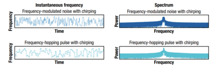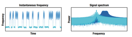 图4. 收到的数据。未经处理的、经过时间转换的I/Q数据,由两种不同的技术组成,具有各种重叠的波形参数和调制。图中用彩色编码来区分频率调制噪声技术(蓝色)和跳频脉冲技术(青色)。
