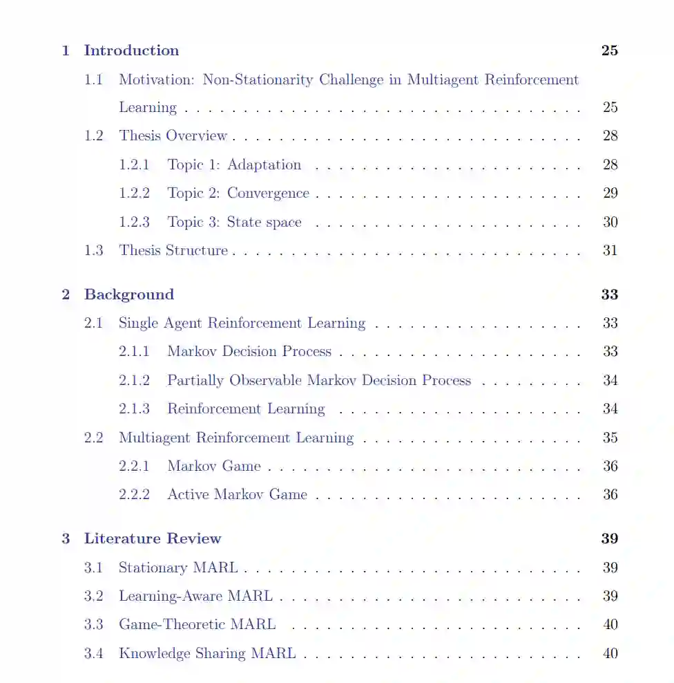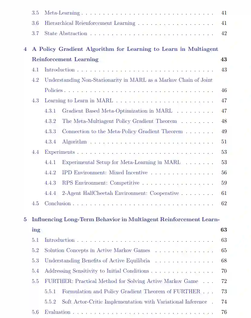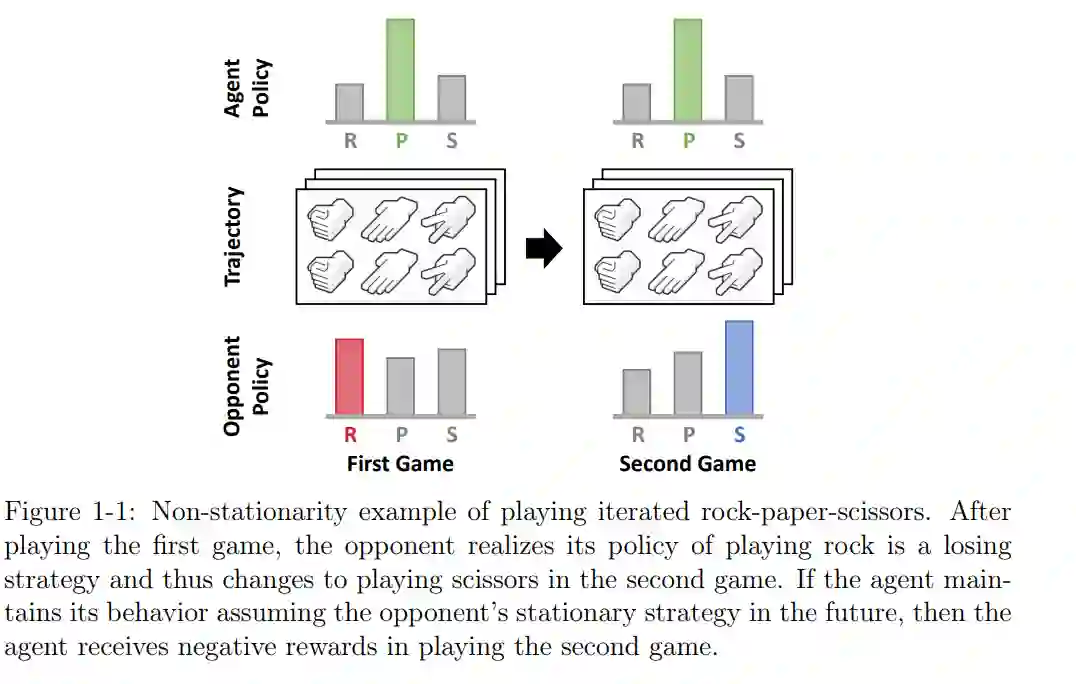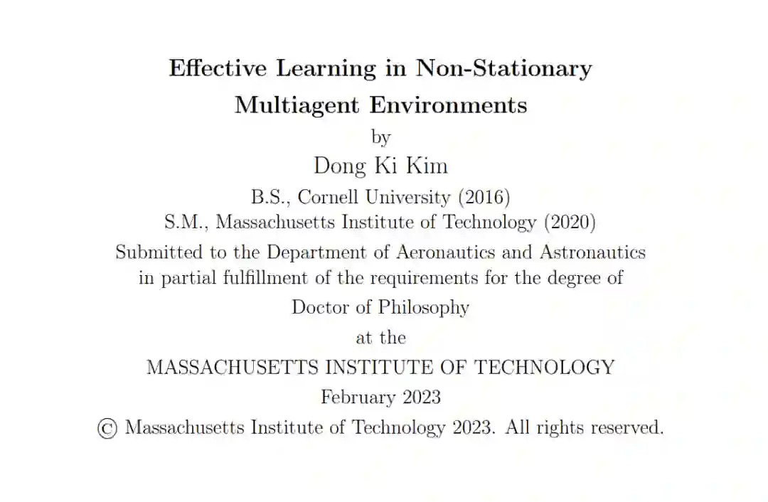 多智能体强化学习(MARL)为一组人工智能代理提供了一个有原则的框架,使它们能够在人类专家水平上学习协作和/或竞争行为。多智能体学习环境本质上比单智能体学习解决了更复杂的问题,因为代理既与环境互动,也与其他代理互动。特别是,在MARL中,多个代理同时学习,导致在遇到的经验中产生自然的非平稳性,因此要求每个代理在其他代理策略可能发生较大变化的情况下调整其行为。本论文旨在从三个重要主题来解决多智能体学习中的非平稳性挑战:1)适应性,2)收敛性,3)状态空间。第一个主题解答了代理如何通过开发新的元学习框架来学习有效的适应策略,以应对其他代理不断变化的策略。第二个主题解答了代理如何适应并影响联合学习过程,使得基于新的博弈论解决方案概念,策略在学习结束时收敛到更理想的极限行为。最后,最后一个主题解答了如何基于知识共享和上下文特定抽象来减小状态空间大小,从而使学习复杂性受到非平稳性的影响较小。总之,本论文发展了理论和算法贡献,为上述关于非平稳性的主题提供了有原则的解答。本论文中开发的算法在多智能体基准领域的多样化套件中展示了其有效性,包括混合激励、竞争和合作环境的全谱。