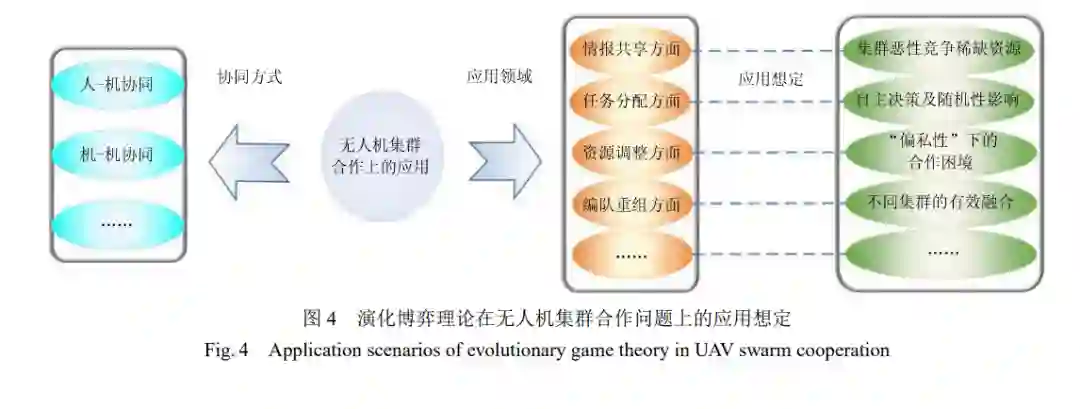 鉴于演化博弈理论在解决合作问题中的广泛应用, 主要探索无人机集群协同控制领域中演化博弈理论的应用前景. 首 先, 介绍演化博弈理论的起源发展及主要思想; 而后分类总结促进合作演化的机制; 接着从情报共享、任务分配、资源调整和编 队重组 4 个方面阐述了具体应用构想; 最后提出待解决的难点问题和解决思路. 从演化博弈的角度为无人机集群的有效协同控 制提供了有意义的探索和借鉴.合作被当作演化的自然法则之一, 在人类社会 进步发展、生物群体进化演化中发挥着非常重要的 作用. 合作行为的普遍出现且能够相对稳定的延续 已经成为一个前沿热点问题[1] . 演化博弈理论[2] 是 传统博弈论结合生物进化论发展而来的, 它将经济 学的 “均衡观” 与生物学的 “适应性” 相结合, 刻画了 在理性不完全、信息不对称、对环境及预期存在偏差 的条件下, 群体通过学习、模仿、试错而不断适应外 部环境, 最终达到演化稳定状态 (Evolutionary Stable State, ESS)[3] 的过程, 演化博弈为多智能体之间的交 互提供了一种有效的研究框架[4−5] . 近年来, 众多学 者利用演化博弈理论研究合作问题, 取得了很多重 要成果, 并在解决实际问题中广泛应用.无人机集群被当作未来战场中智能作战的主要 样式, 其自主协同能力是影响战斗力生成的关键问 题. 高度智能化的无人机个体在有限信息、有限资源 的条件下稳定合作并有效协同, 与演化博弈的思想 不谋而合. 所以, 用演化博弈理论解决无人机集群合 作问题极具理论价值和现实意义. 无人机集群协同控制方法大体分为集中式和分 布式两类, 其中分布式方法逐渐成为热点, 发展出协 商一致理论、信息素、博弈论、多智能体系统等多种 方法. 国内学者在此方向取得了很多成果[6] , 最具代 表性的是国防科技大学沈林成教授团队, 对无人机 集群协同控制的多个问题都有分析总结, 具有非常 高的指导价值[7−9] . 针对于此, 我们梳理了促进合作演化的机制, 并 参考无人机集群的发展现状及应用前景, 对未来无 人机集群作战中的具体任务, 提出演化博弈理论框 架下的应用想定, 旨在对提高和完善无人机集群的 自主协同能力提供新的思路和方案.