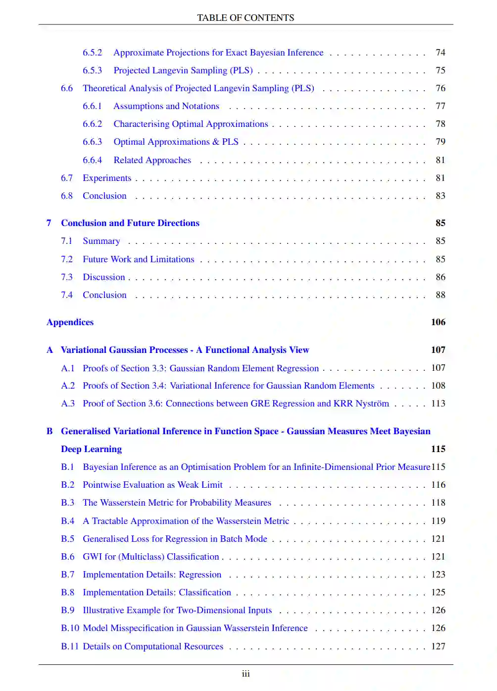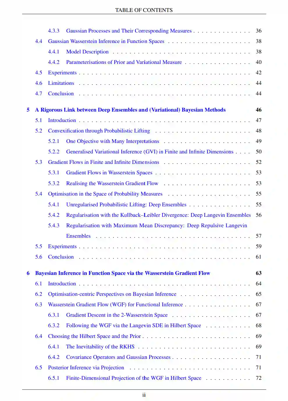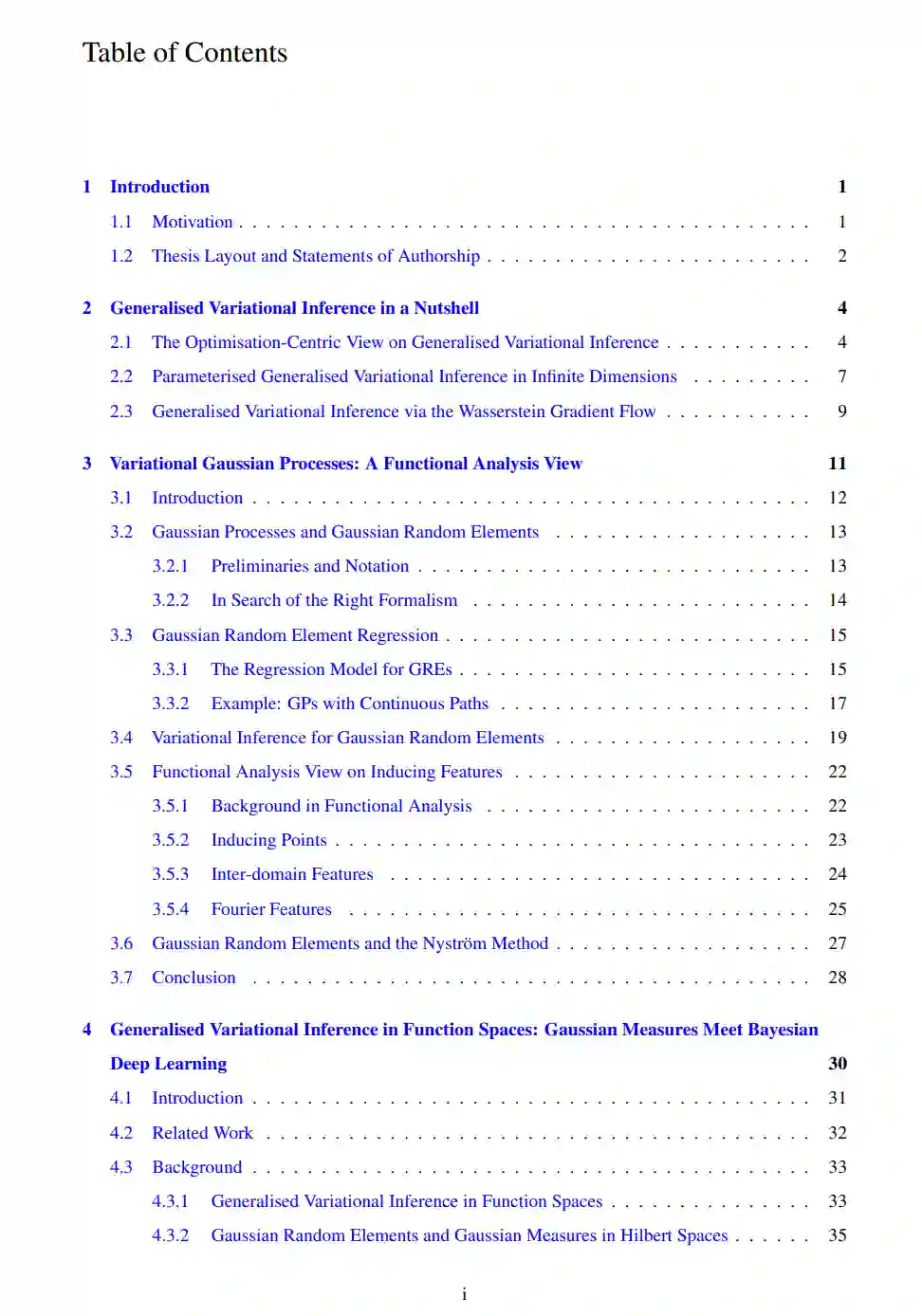 尽管 GVI,尤其是 VI,先前已经被用于函数空间推断,但人们一直忽略了参数空间的无限维特性。这一局限阻碍了新推断方法的发展,而这些方法的提出有赖于对支撑 VI 与 GVI 的数学结构的深入理解。 本论文弥补了这一空白,通过引入无限维分析与概率论中的数学概念,推动了相关理论的发展。具体而言,我们利用巴拿赫空间(Banach space)中的高斯随机元来形式化函数空间推断下的 VI 与 GVI,从而能够使用新的分析工具——例如 Wasserstein 梯度流 或 高斯测度空间中的参数化方法——来求解 VI 与 GVI 的优化问题。