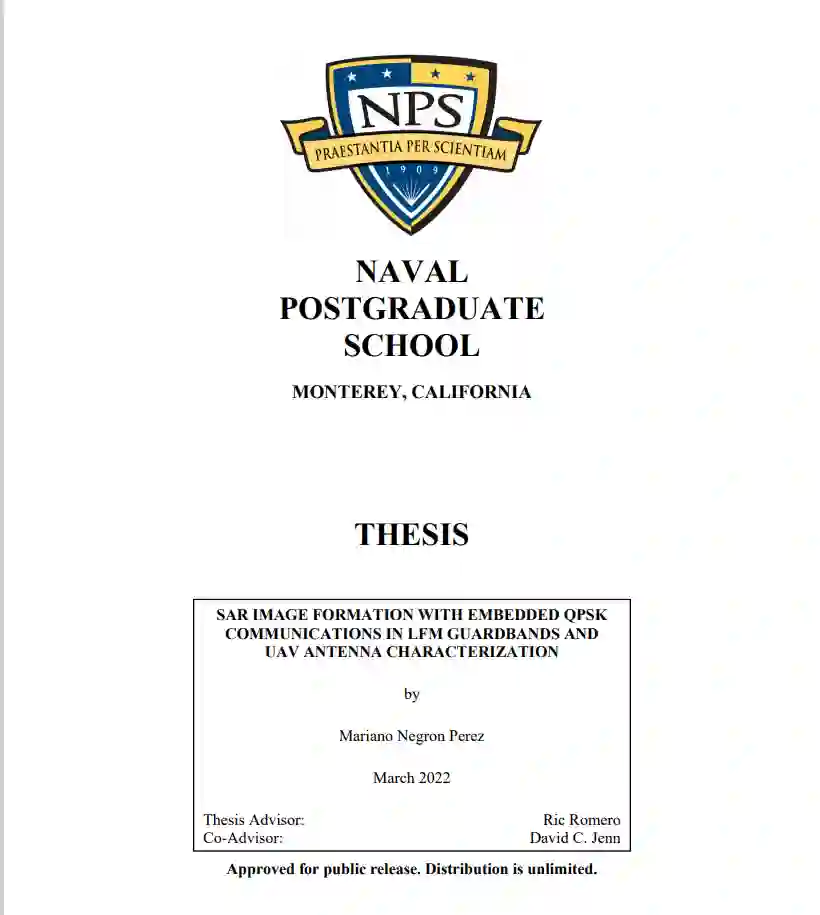 为了实现合成孔径雷达成像的无人机系统,必须对几个方面进行研究,但我们只关注两个方面。其目的是:a)模拟通信-雷达波形并产生合成孔径雷达图像,以及b)描述可能用于无人机的天线的性能。在第2章至第4章中,我们研究嵌入式通信信号是否会降低或改善SAR图像的形成。在第5章和第6章中,我们用无人机进行实验,将射频信号传输到地面接收器,以表征潜在的候选天线。