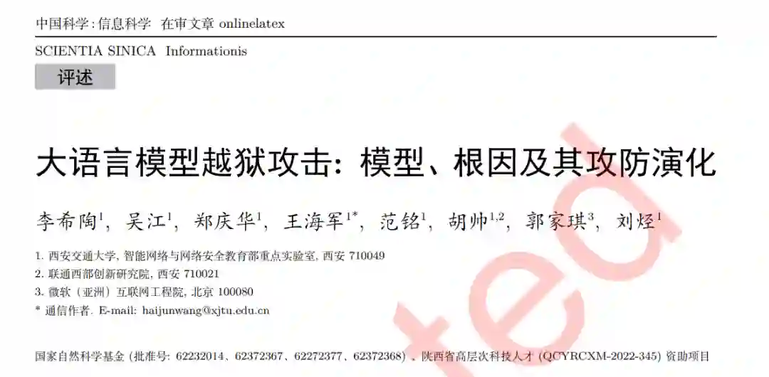 大语言模型在各种应用中表现突出, 被广泛应用, 成为打造新质生产力的重要引擎. 然而, 当 恶意使用者利用特定技巧绕过模型的对齐等安全保护机制时, 就可能导致越狱攻击, 生成违反模型使 用准则、道德或法律的内容, 引发伦理问题. 本文分析总结了越狱攻击的起源及其攻防演变过程, 首 先根据方法、对象、目标三要素提出了越狱攻击的定义和形式化模型; 从大语言模型的发展历程和对 安全性认知的变化两个角度, 分析了越狱攻击的发展历史, 将越狱攻击存在的根因总结为大语言模型 的服务属性与价值观的不匹配; 最后, 从攻防博弈的角度总结越狱攻防的演化过程, 探讨了越狱攻击 的新型威胁模式和防御方法发展方向。