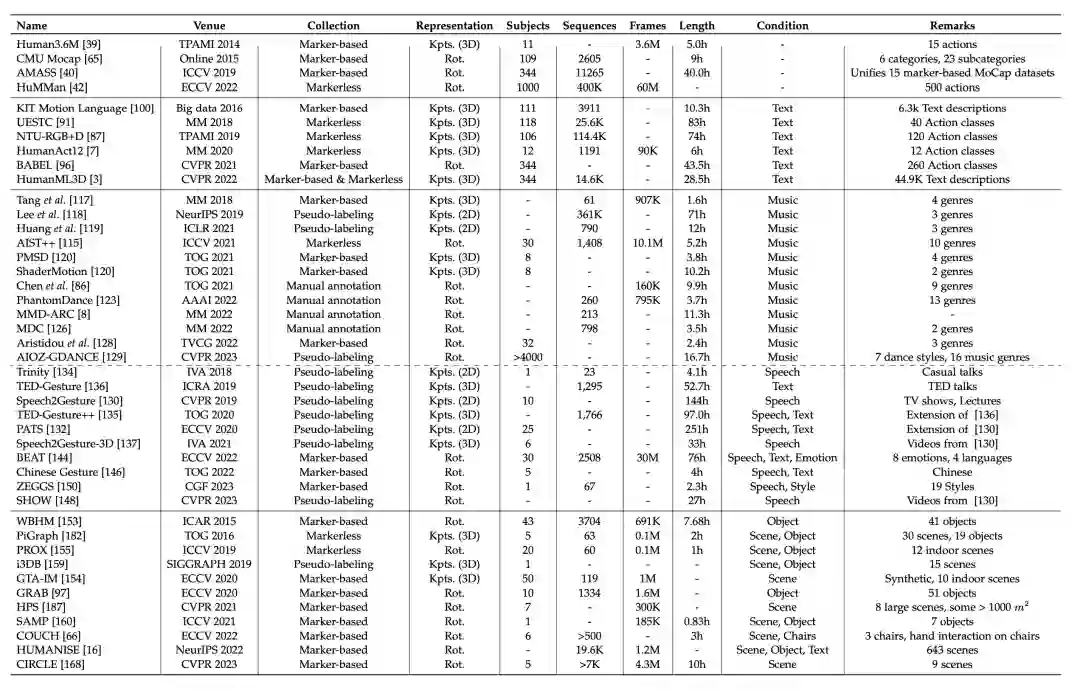 我们分别总结了与文本、音频和场景条件相关的人体动作数据集。这些数据集涵盖了各种动作类别、音频类型和场景类型,为人体动作生成研究提供了丰富的数据资源,如表2所示。