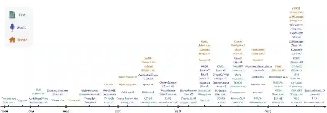 基于这一领域的快速发展和涌现的挑战,我们提供了这篇全面的综述,以帮助研究界跟踪其进展。图2总结了近年来人体动作生成方法的发展。