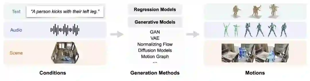 人体动作生成的需求通常包括一个条件信号,如文本描述、背景音频或周围环境,如图1所示。因此生成的动作不仅本身应该合理,还应与条件信号协调一致。