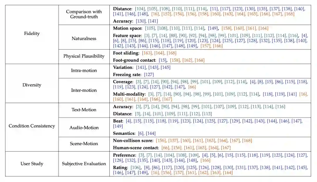 表3. 人体动作生成主要评价指标总结。绿色、蓝色、橙色分别代表文本驱动、音频驱动和场景驱动的研究工作。