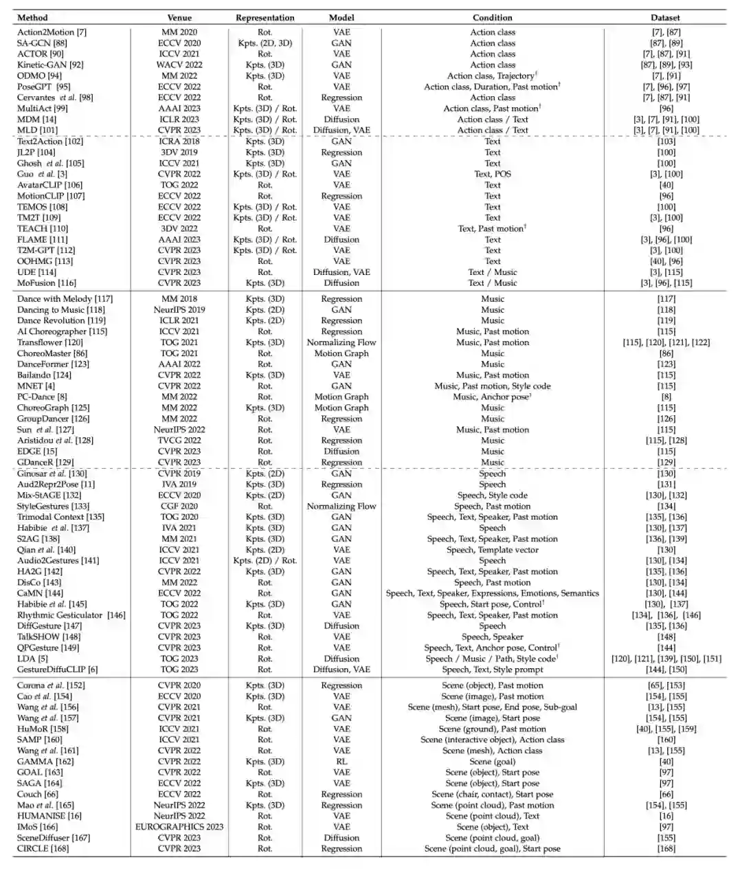 本篇综述论文主要关注基于条件信号的人体动作生成任务,包括文本驱动、音频驱动和场景驱动,并分别总结了这些方法的代表性成果,如表1所示。