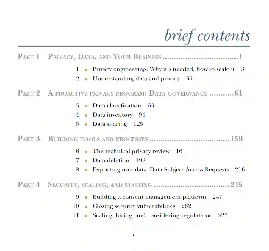 本书主要有两个目的。首先,它旨在成为工程师使用工具、自动化和流程来解决隐私问题的垫脚石。我不仅提供了实际操作的实现技术,还提供了在快速发展的公司中至关重要的业务环境。其次,这本书的目的是帮助企业、政府和媒体的决策者提供正确的指导,以帮助企业茁壮成长,并保护客户数据。 本书分为4部分和11章。书挡,即第一部分和第四部分,提供上下文指导,并将帮助工程师开发可扩展的隐私计划。第二部分和第三部分分别提供专注于数据治理和工具的实践技能。 第一部分关注隐私工程如何成为公司整体创新生态系统的一部分: