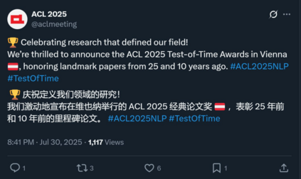 今年,ACL 宣布了两个时间检验奖: 25-Year ToT Award (2000) 和 10-Year ToT Award (2015),即二十五年时间检验奖和十年时间检验奖。