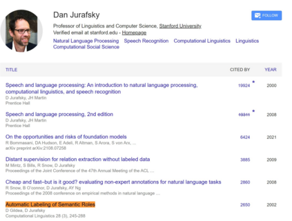 该论文的两位作者 ——Daniel Gildea 现在是美国罗切斯特大学计算机科学系的教授;Daniel Jurafsky 是斯坦福大学语言学和计算机科学系教授,也是自然语言处理领域的泰斗级人物,他与 James H. Martin 合著的《语音与语言处理》(Speech and Language Processing)被翻译成 60 多种语言,是全球 NLP 领域最经典的教科书之一。