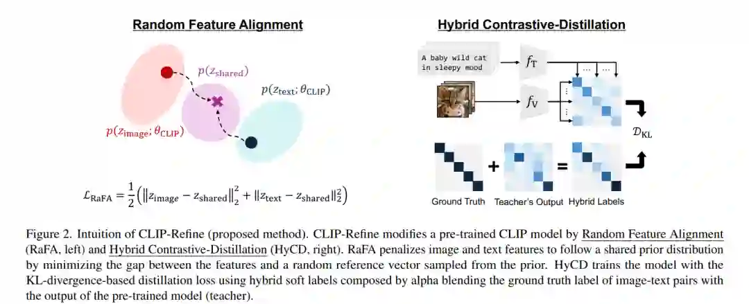 对比语言-图像预训练(Contrastive Language-Image Pre-training, CLIP)是构建现代视觉-语言基础模型的核心组成部分。尽管 CLIP 在下游任务中展现出出色的零样本(zero-shot)性能,其多模态特征空间仍然存在模态差距(modality gap)——即图像与文本特征之间的聚类差异,这限制了下游任务的表现。 虽然已有研究试图通过修改预训练或微调流程来缓解这一模态差距,但往往面临两个难题:需要大规模数据集带来的高昂训练成本,或在零样本性能上的显著下降。 本文提出了一种新的后预训练方法,命名为 CLIP-Refine,该方法介于 CLIP 的预训练与微调阶段之间。CLIP-Refine 的目标是对特征空间进行对齐,通过在小规模图文配对数据集上仅训练 1 个 epoch,实现无损的零样本性能优化。 为此,我们提出了两项关键技术: 1. 随机特征对齐(RaFA, Random Feature Alignment):通过最小化图像与文本特征与随机采样的参考向量之间的距离,使其分布趋向于共享的先验分布,从而实现模态间对齐。 1. 混合对比-蒸馏学习(HyCD, Hybrid Contrastive-Distillation):结合图文对的真实标签与预训练 CLIP 模型的输出,生成软标签,用于更新模型。这种方式在保留原有知识的同时,促进了新知识的学习,实现更优的特征对齐效果。