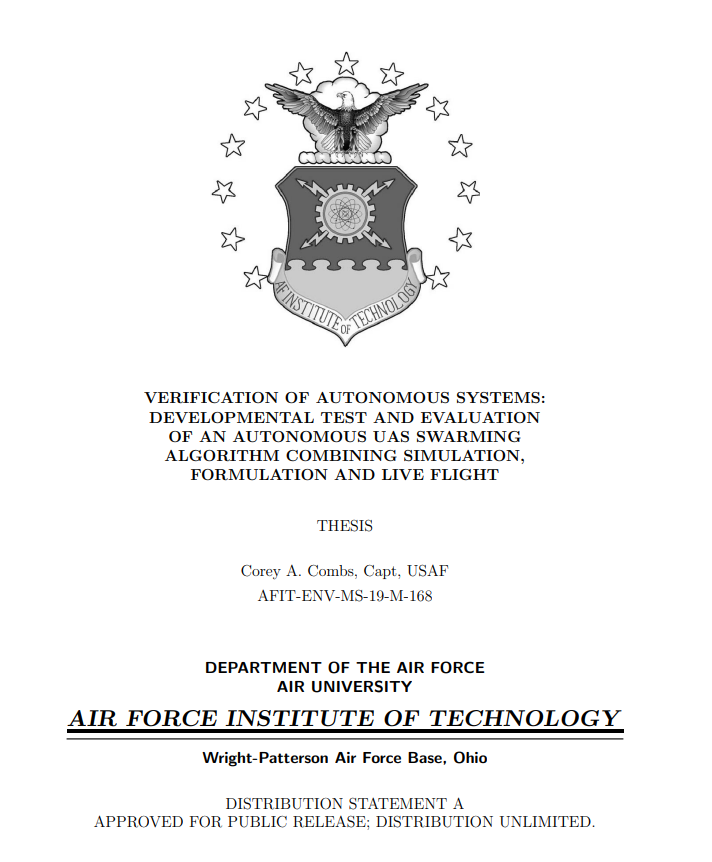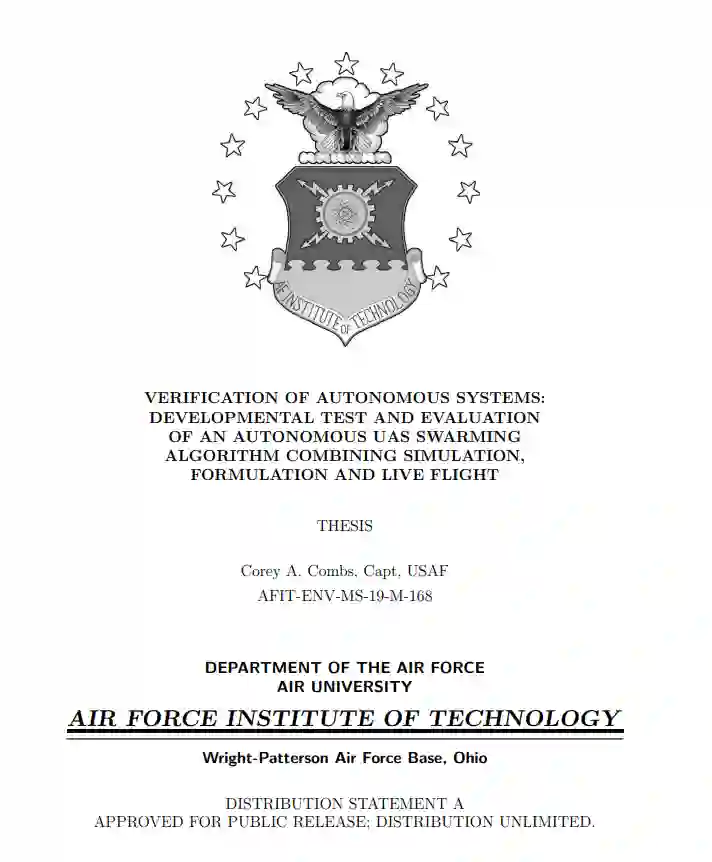 这项研究是由本世纪以来自主系统的增加以及测试和评估其性能的挑战性所驱动。对当前文献的回顾显示,提出了验证自主系统的方法,但很少有实施。它暴露了当前验证和确认方法中的一些差距,并提出了填补这些差距的目标。通过使用建模、软件循环(SITL)和飞行测试,这项研究验证了无人驾驶航空系统(UAS)的自主蜂群算法,并验证了测试框架的一个典范。