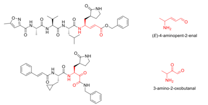 SARS-CoV-2 3CL蛋白酶的结合中心可分为S1、S1’、S2和S4四个子位点,每个子位点对不同的结构有偏向性,文章把这些可促进与子位点作用的片段称为有利片段,nmatch则代表生成的结构中有利片段的数量,Ntotal是从文献工作中总结得到的有利片段总数目。wcon代表片段得分的权重,默认值为0.6。fpha表示药效团得分,主要取决于晶体结构的配体-蛋白质相互作用模式(PDB ID: 6LU7),当生成结构与定义的药效团匹配时则为1,反之为0;wpha表示药效团得分权重,默认值为0.4。初始结构选择如上所述,需要选定初始结构作为核心片段才能进行片段延伸等操作,这是一个关键而不简单的任务,依赖于药物化学家的经验,而4-氨基戊-2-烯醛和3-氨基-2-氧代丁醛都已被验证可与SARS或SARS-CoV-2 3CL蛋白酶的半胱氨酸145形成共价键(如图2所示),文章使用这两个骨架作为初始结构。
