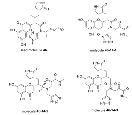 图2 初始结构示意图**——结果——文章使用上述的ADQN-FBDD模型自动生成了4922个有效结构,根据类药性>0.1和奖励函数R(s)>=0.6过滤得到了47个分子。随后对这47个分子进行了非共价对接、共价对接、共价与非共价对接的结合构象RMSD差异以及聚类分析,最终选择了分子#46(共价对接分数:-8.722 kcal/mol,RMSD: 1.71 Å)作为先导分子,并参照辉瑞PF-00835231、PF-07321332分子与蛋白的结合模式,用甲酰胺代替了醛,α-酮酰胺代替了 1,4 Michael 受体,得到46-14-1**;为了进一步提高分子极性,将酰胺替换成磺酰胺,得到46-14-2;为了提高分子的柔性,再在磺酰胺旁的碳链上延长一个碳原子,得到46-14-3(如图3所示),相关合成及验证实验正在进行中。