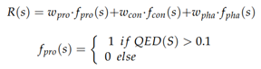 图1 ADQN-FBDD模型框架图(A)强化学习示意图。(B)基于片段的工作举例。(C)状态更新路径示意图在文章中,每个状态就是一个分子结构图,给定一个初始结构,可选的动作有从片段库中选择增加片段、删除片段和不做改动三种。决定动作后,下一个状态的分子结构由SMARTS预定义的45条化学反应规则生成。生成状态的奖励函数由最终属性得分、特定片段得分(CSF)和药效团得分组成: 其中,fpro代表类药性(QED),基于8个分子特征计算得来,取值在0到1之间;wpro代表类药性的权重,默认值是0.1;fcon代表特定片段得分fCSF,其计算式如下: