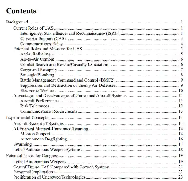 此外,美国防部正在开发一些实验概念,如飞机系统体系、群集和致命自主武器,以探索使用未来几代无人机的新方法。在评估潜在新的和未来无人机项目、任务和概念的拨款和授权时,国会可能会考虑以下问题: