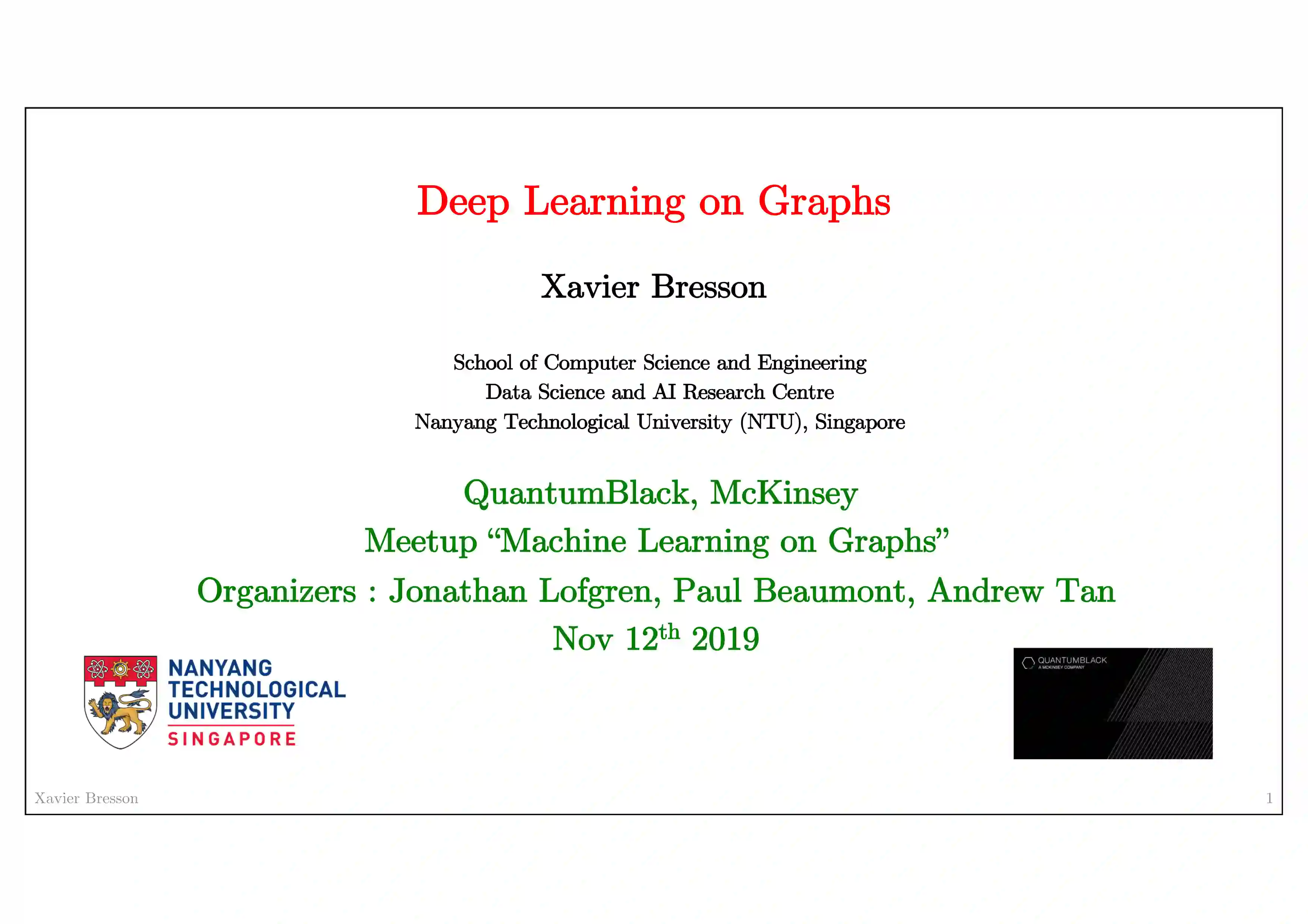 嘉宾介绍: Xavier Bresson,NTU计算机科学副教授。 他是图深度学习领域的领先研究人员,图深度学习是一个新的框架,该框架结合了图和深度学习技术,可以处理多个领域的复杂数据。 演讲的目的是介绍基于图的卷积神经网络体系结构,以及此类问题的应用。