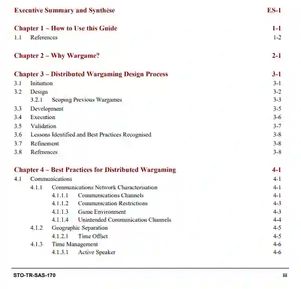 SAS-170 利用这一框架开发了两个调查工具,通过 1)在线调查;2)在线研讨会,从北约各国兵棋推演实践者那里收集最佳实践想法。收集到的数据由 SAS-170 成员进行审核,并与分布式兵棋推演框架的所有子要素进行映射。绘制完成后,利用 SAS-170 成员的专家判断提取最佳实践想法,然后以《分布式兵棋推演最佳实践指南》(简称“指南”)的形式编写。由于兵棋推演(无论是否分布式)是一项极其多样的工作,最佳实践数据还表明了游戏设计者必须考虑的权衡问题,因此《指南》还包含了有关分布式兵棋各要素的益处和缺陷的信息。《指南》旨在提供实用参考,因此并不试图对任何主题进行深入探讨,也不打算作为兵棋推演初学者的读物。不过,《指南》中有一节介绍了兵棋推演的价值所在,这为后续章节提供分布式兵棋推演设计的实用指南以及最佳实践本身奠定了基础。
