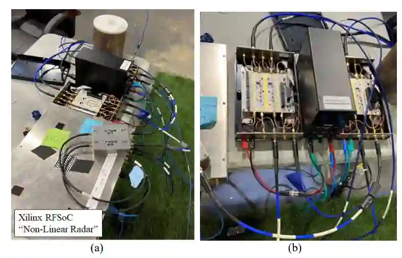 图1 步进频率雷达收发器:(a)赛灵思的RFSoC与Alion/HII的雷达固件,以及(b)定制的发射器/接收器(Tx/Rx)滤波器和放大器PCB,由28VDC供电