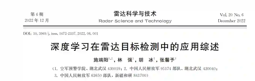 雷达目标检测技术能够判断回波信号中目标存在与否,并提取目标位置信息。随着雷达图像 质量的提升和人工智能技术的发展,利用雷达图像数据通过深度学习方法实现雷达目标检测功能成为一种 新的思路。该文首先从雷达目标检测原理入手,对传统和现代两类检测方法进行了梳理,分析了各类检测 方法的特点及适用性。然后针对现代雷达回波信号复杂性增大导致传统检测方法统计建模难的问题和机 器学习方法特征提取难度大的问题,对深度学习目标检测方法进行了归纳,主要从深度学习算法、雷达回波 图像数据类型和应用场景三个方面进行总结。最后分析了深度学习在雷达目标检测应用中面临的挑战,展 望了未来的发展趋势。目标检测作为雷达的基本功能之一,是雷达 目标跟踪和目标识别的前提,其检测性能的好坏 决定了雷达探测能力的高低。雷达接收的回波 中,既有目标,也有杂波和噪声等干扰信号。雷达 目标检测技术的本质是在噪声和杂波条件下对目 标存在与否的判决问题和目标的定位问题。目标 定位问题可以通过测量回波信号的延迟时间和雷 达天线的方向性予以解决。判决问题是当前雷达 目标检测面临的主要挑战。 早期的雷达大多采用非相参体制,没有专门 的信号处理设备,目标检测功能是在雷达显示器 上,通过人工观测回波幅度的高低来实现。虽然 人工检测方法在目前许多雷达中仍有使用,但人 工观测无法适应长时间的工作和大批量目标的处 理。因此,需要雷达具备目标自动检测功能。雷达目标自动检测技术根据检测门限和判决准则判 断是否存在目标。雷达目标自动检测的理论基础 是统计检测理论。实际上,雷达回波信号的统计 特性无法预知,导致检测门限难以确定。检测门 限过高会造成漏警,检测门限过低会导致虚警。 为了解 决 这 个 问 题,恒 虚 警 率 (ConstantFalse AlarmRate,CFAR)检测技术[1]应运而生。但传 统的CFAR检测技术主要通过回波能量实现目标 检测,由于可用于参考的单元环境有限,易受到资 源的限制,对于微弱目标易造成漏警[2]。 近年来,深度学习技术在光学图像处理领域 的应用发展迅速,尤其在目标检测[3]、图像分类[4] 和图像分割[5]等方面成果显著。由于雷达技术的 进步,雷达分辨率逐渐提升,不同形式的雷达图像 数据的质量越来越好。虽然雷达图像信息量比光 学图像严重不足,在成像机理、目标特性、分辨率 等方面存在差异,但深度学习强大的图像特征自 动提取能力,为雷达目标检测技术提供了一种新 的思路。在图像层面上,可将雷达目标检测视为 一项计算机视觉任务,在图像中将目标与背景进 行区分,并对每个目标进行精准定位和分类标签 预测,从而实现雷达目标检测功能。