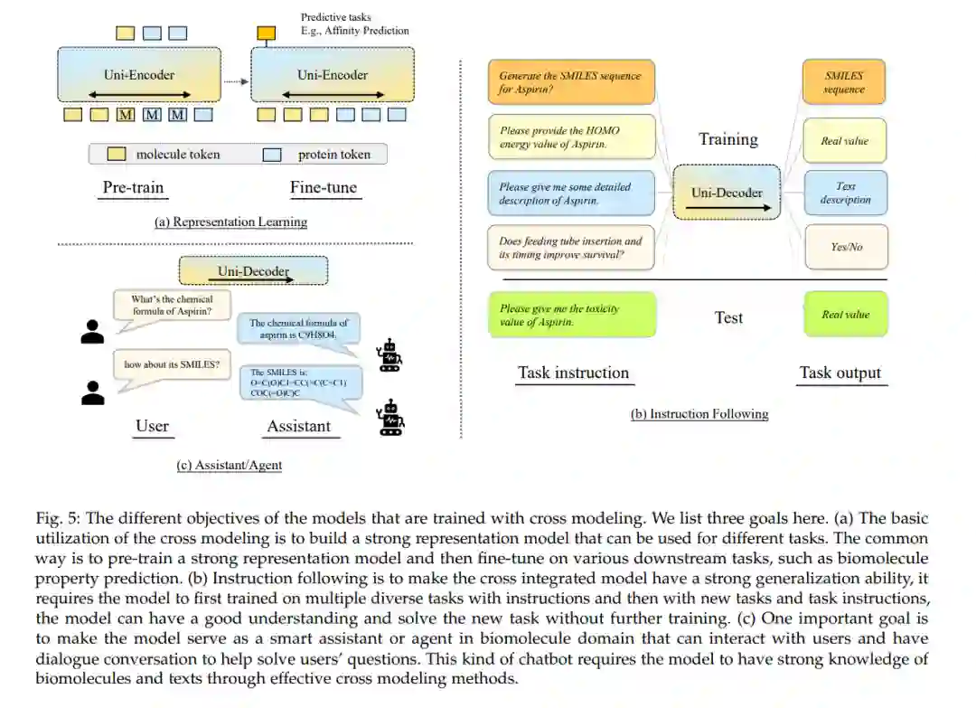 整合生物分子与外部知识源的主要目标是开发能够理解和预测生物分子在生物学上下文中的复杂行为和相互作用的模型。通过结合内在的分子特征和外部文本信息,这些模型可以获得生物分子的更全面表示。我们探索了体现整合目标的三种不同方法:表示学习、指令跟随和代理/助理模型,每种方法都独特地贡献于该领域(见图5以获得视觉理解)。