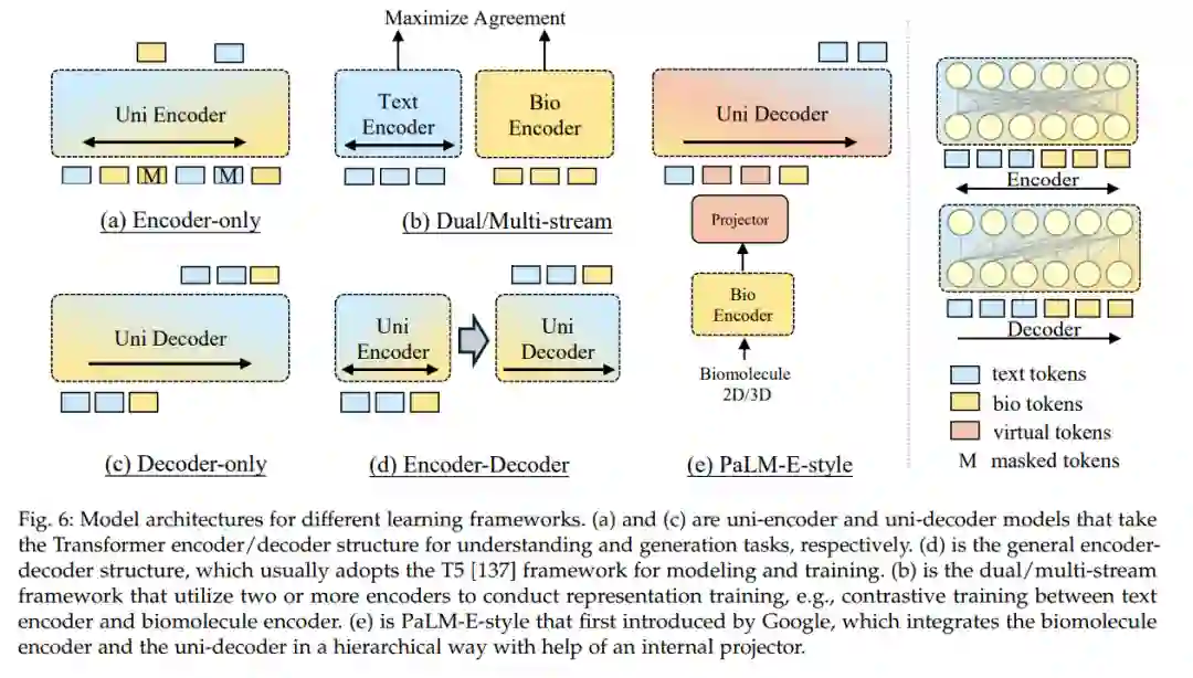 PaLM-E风格模型和双/多流模型进一步扩展了Transformer的应用,通过引入额外的编码器或投影器来增强模型处理多模态数据的能力。这些变体模型通过整合更广泛的生物学知识和数据,旨在提高模型在生物分子预测、生成和解释任务中的性能。